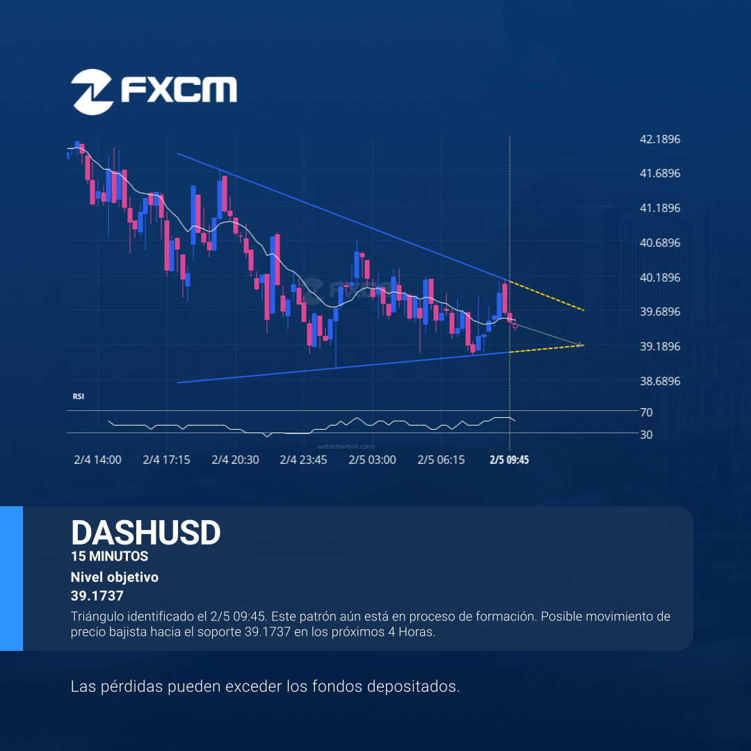 Triángulo identificado el 2/5 09:45. Este patrón aún está en proceso de formación. Posible movimiento de precio bajista hacia el soporte 39.1737 en los próximos 4 Horas.