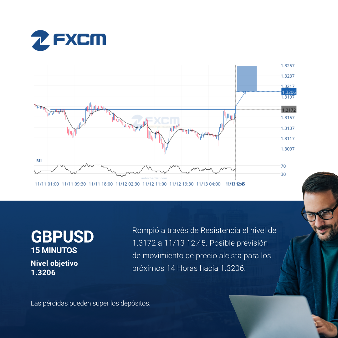 Rompió a través de Resistencia el nivel de 1.3172 a 11/13 12:45. Posible previsión de movimiento de precio alcista para los próximos 14 Horas hacia 1.3206.