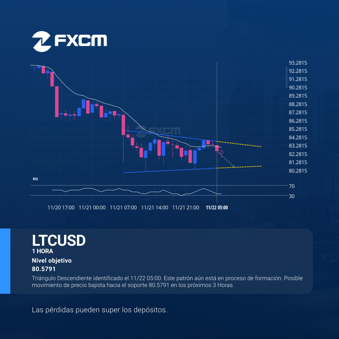 Triángulo Descendiente identificado el 11/22 05:00. Este patrón aún está en proceso de formación. Posible movimiento de precio bajista hacia el soporte 80.5791 en los próximos 3 Horas.