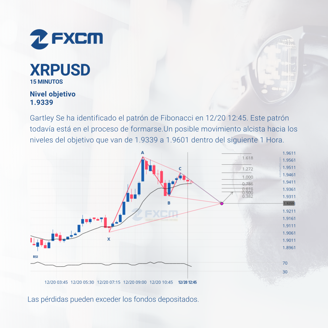 Gartley Se ha identificado el patrón de Fibonacci en 12/20 12:45. Este patrón todavía está en el proceso de formarse.Un posible movimiento alcista hacia los niveles del objetivo que van de 1.9339 a 1.9601 dentro del siguiente 1 Hora.