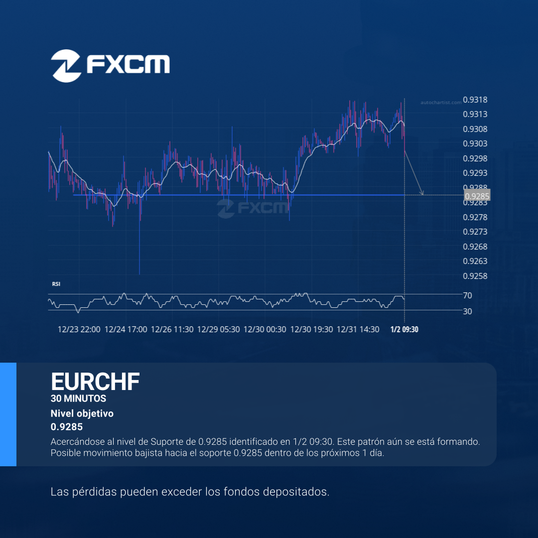 Acercándose al nivel de Suporte de 0.9285 identificado en 1/2 09:30. Este patrón aún se está formando. Posible movimiento bajista hacia el soporte 0.9285 dentro de los próximos 1 día.