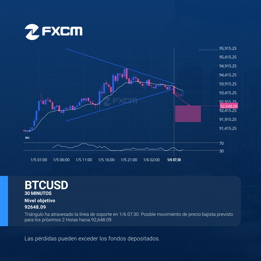 Triángulo ha atravesado la línea de soporte en 1/6 07:30. Posible movimiento de precio bajista previsto para los próximos 2 Horas hacia 92,648.09.