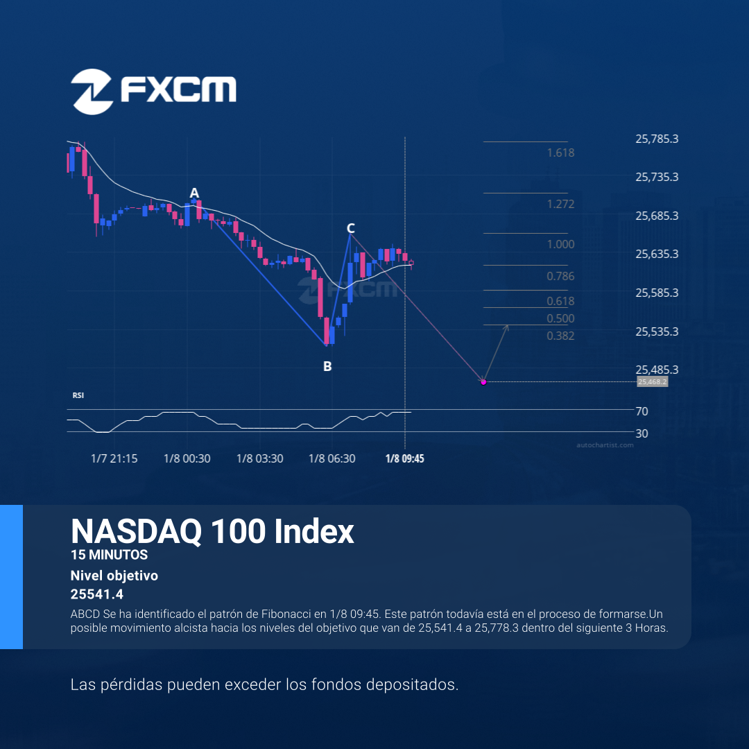 ABCD Se ha identificado el patrón de Fibonacci en 1/8 09:45. Este patrón todavía está en el proceso de formarse.Un posible movimiento alcista hacia los niveles del objetivo que van de 25,541.4 a 25,778.3 dentro del siguiente 3 Horas.
