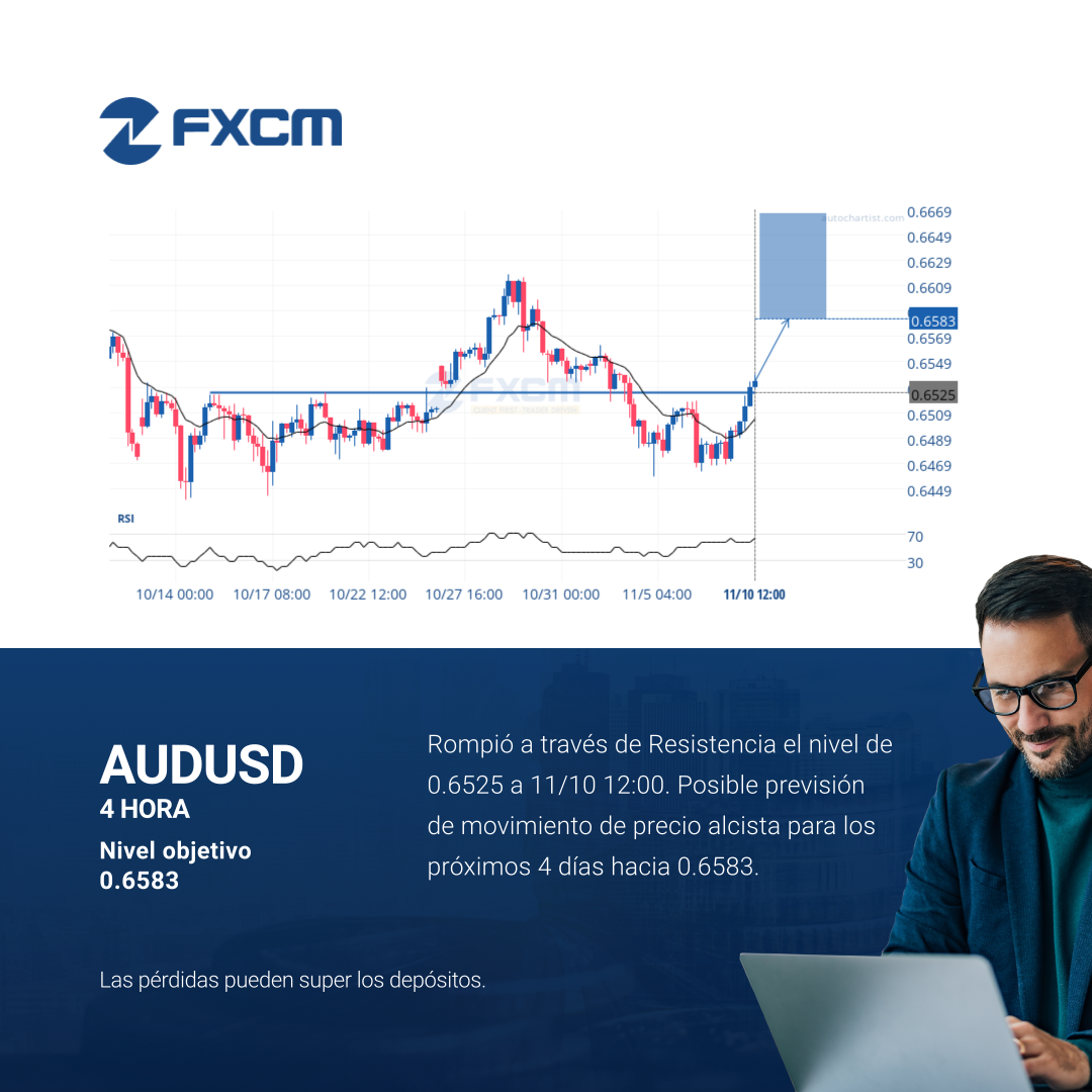 Rompió a través de Resistencia el nivel de 0.6525 a 11/10 12:00. Posible previsión de movimiento de precio alcista para los próximos 4 días hacia 0.6583.