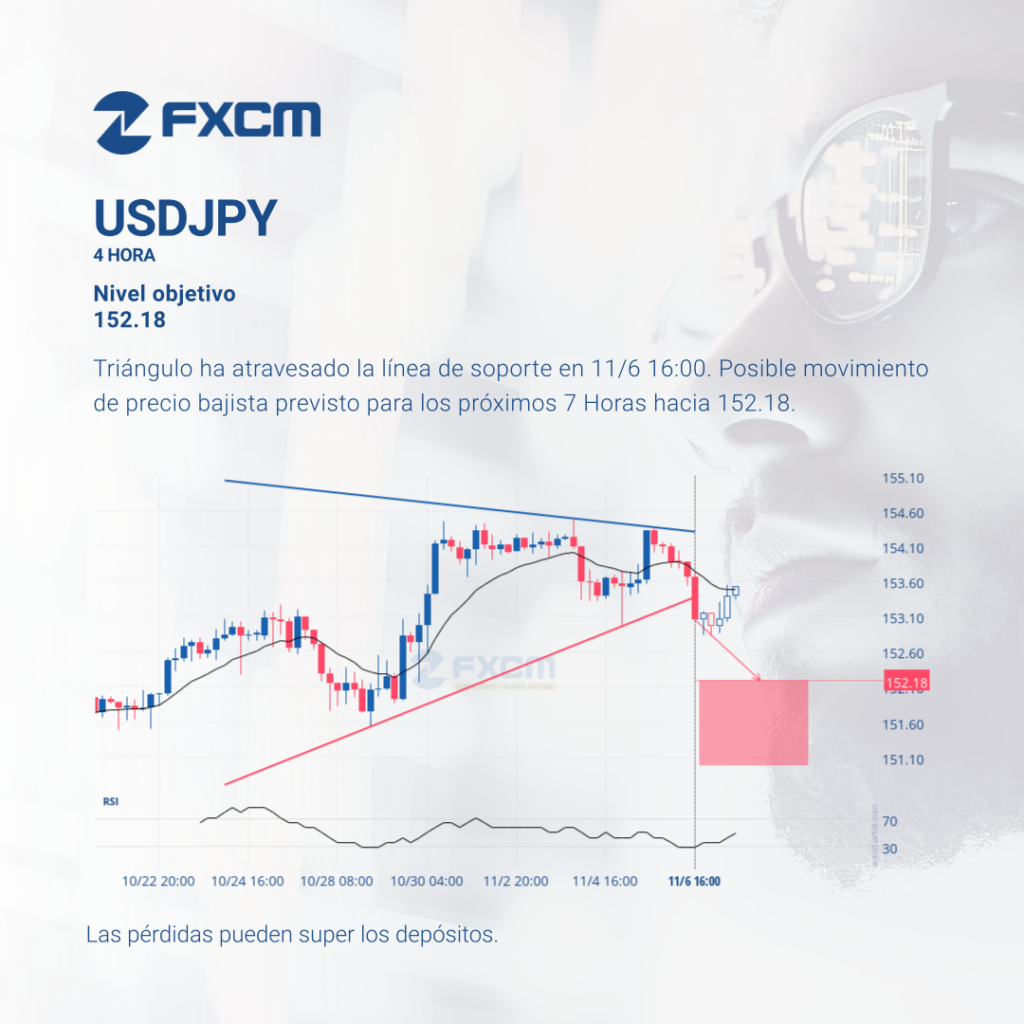 Triángulo ha atravesado la línea de soporte en 11/6 16:00. Posible movimiento de precio bajista previsto para los próximos 7 Horas hacia 152.18. El rendimiento pasado no es indicativo de resultados futuros. Las pérdidas pueden exceder los fondos depositados.