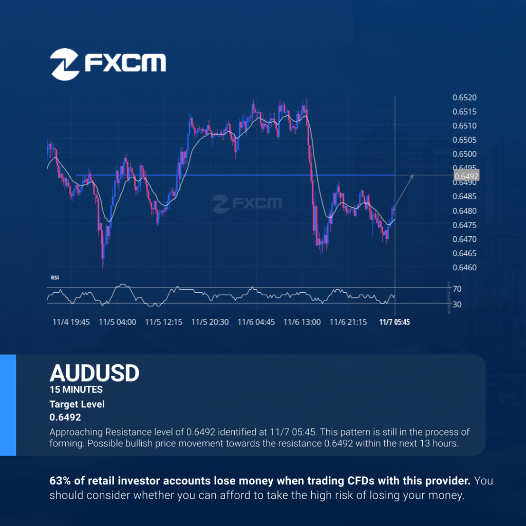 Approaching Resistance level of 0.6492 identified at 11/7 05:45. This pattern is still in the process of forming. Possible bullish price movement towards the resistance 0.6492 within the next 13 hours. Past performance is not an indicator of future results. Losses can exceed deposits.