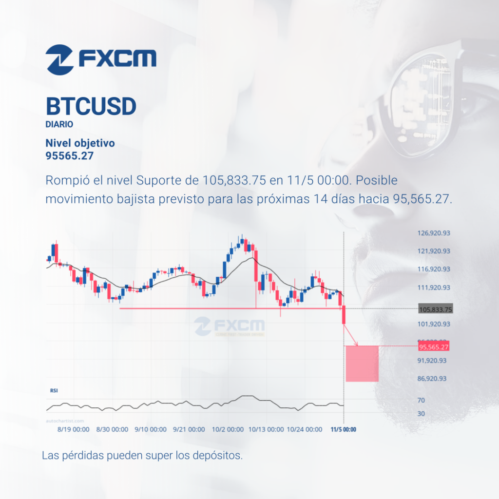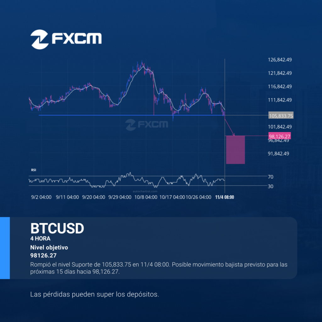 Rompió el nivel Suporte de 105,833.75 en 11/4 08:00. Posible movimiento bajista previsto para las próximas 15 días hacia 98,126.27. El rendimiento pasado no es indicativo de resultados futuros. Las pérdidas pueden exceder los fondos depositados.