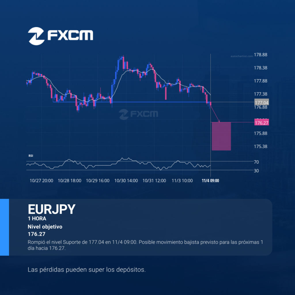 Rompió el nivel Suporte de 177.04 en 11/4 09:00. Posible movimiento bajista previsto para las próximas 1 día hacia 176.27. El rendimiento pasado no es indicativo de resultados futuros. Las pérdidas pueden exceder los fondos depositados.