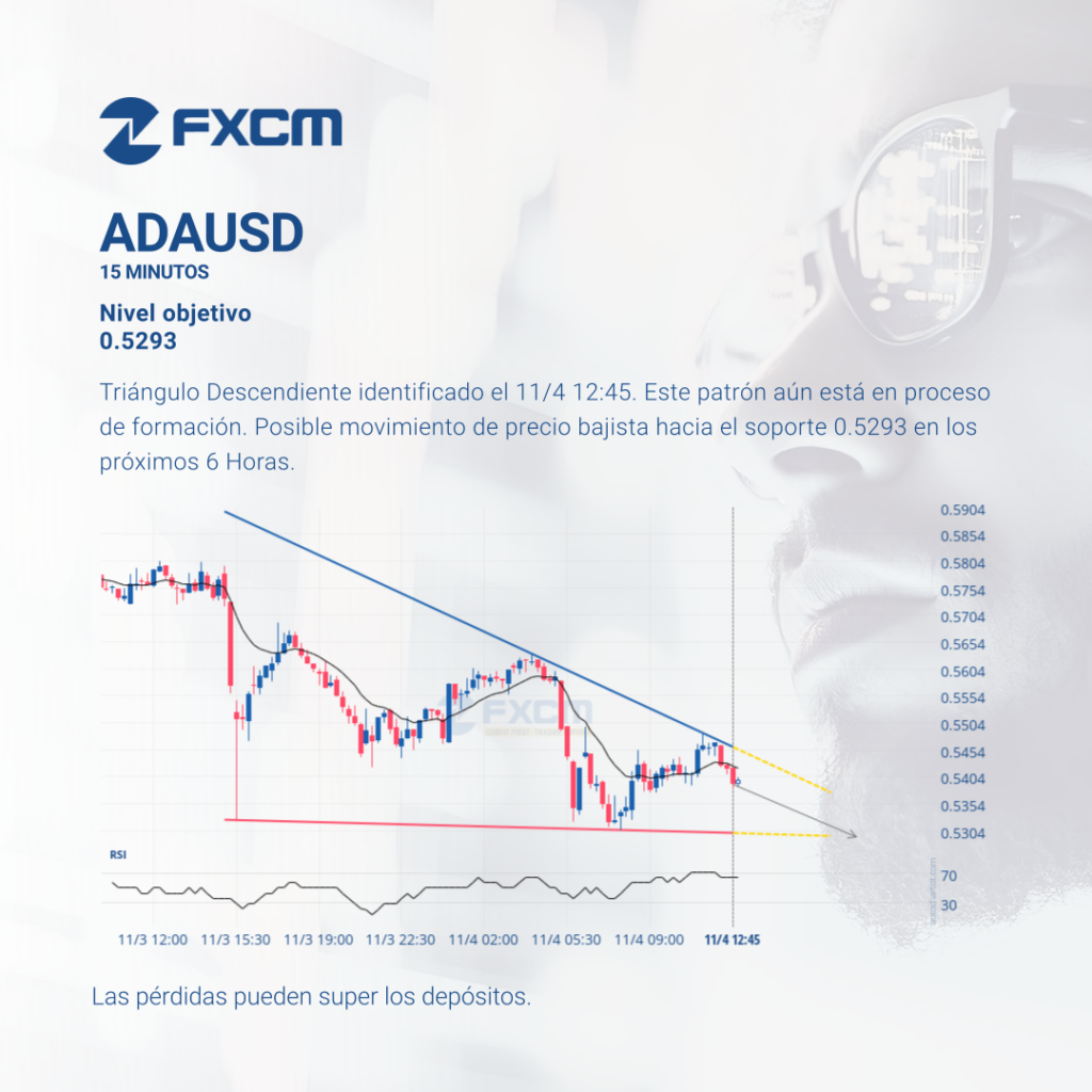 Triángulo Descendiente identificado el 11/4 12:45. Este patrón aún está en proceso de formación. Posible movimiento de precio bajista hacia el soporte 0.5293 en los próximos 6 Horas. El rendimiento pasado no es indicativo de resultados futuros. Las pérdidas pueden exceder los fondos depositados.