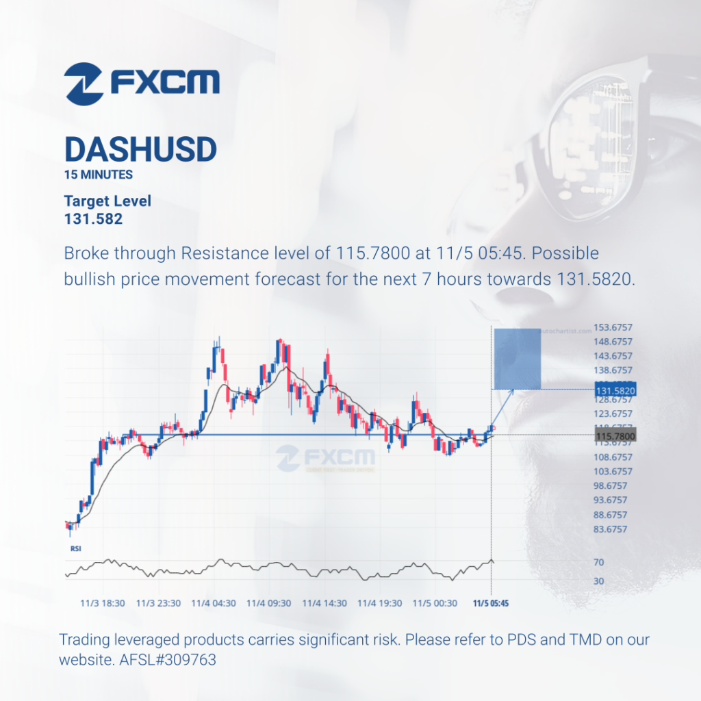 Broke through Resistance level of 115.7800 at 11/5 05:45. Possible bullish price movement forecast for the next 7 hours towards 131.5820. Past performance is not an indicator of future results. Trading leveraged products carries significant risk. Please refer to PDS and TMD on our website. AFSL#309763