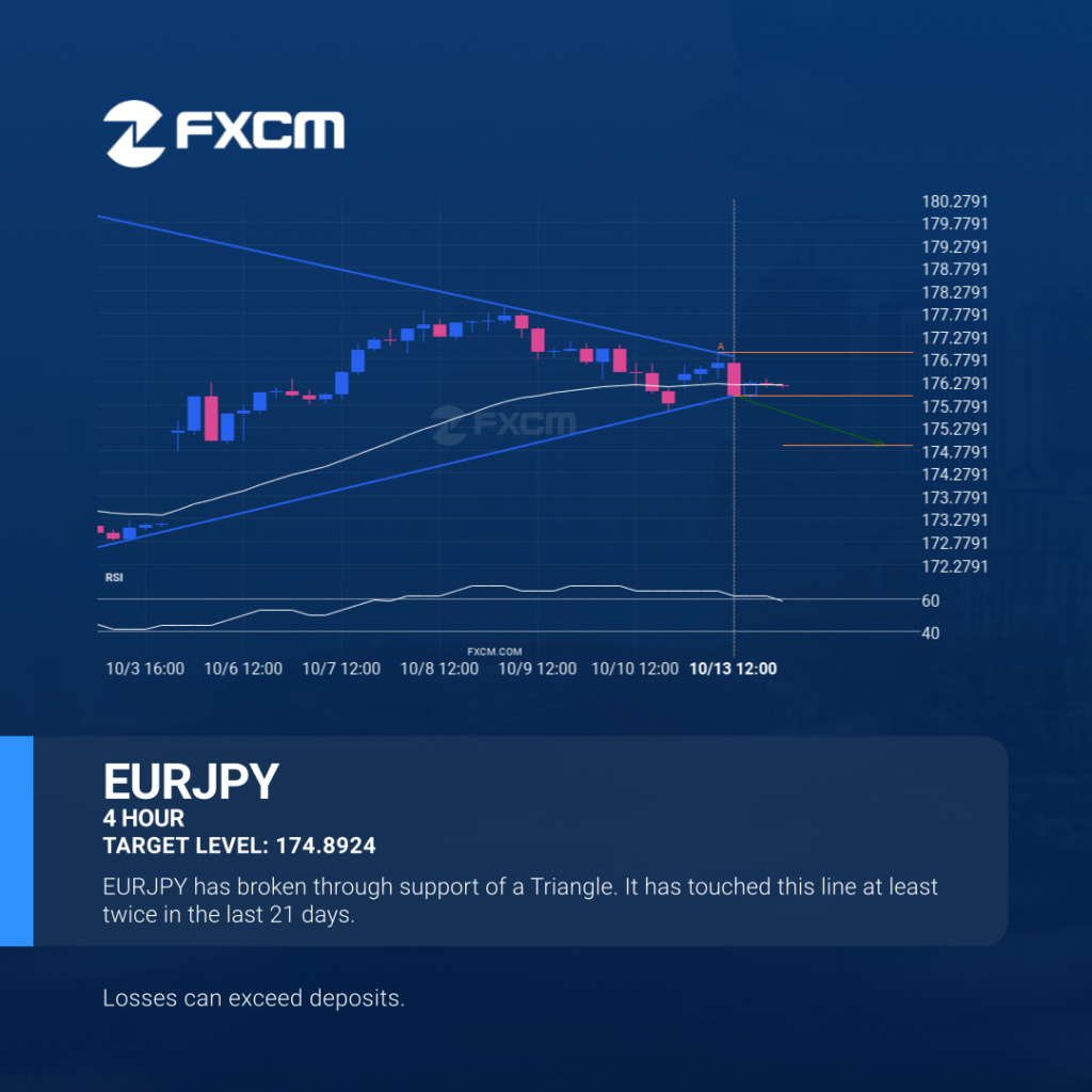 The last 21 4 hour candles on EURJPY formed a Triangle pattern and broken out through the pattern lines, indicating a possible bearish movement towards the price level of 174.8924. Past performance is not an indicator of future results. Losses can exceed deposits.