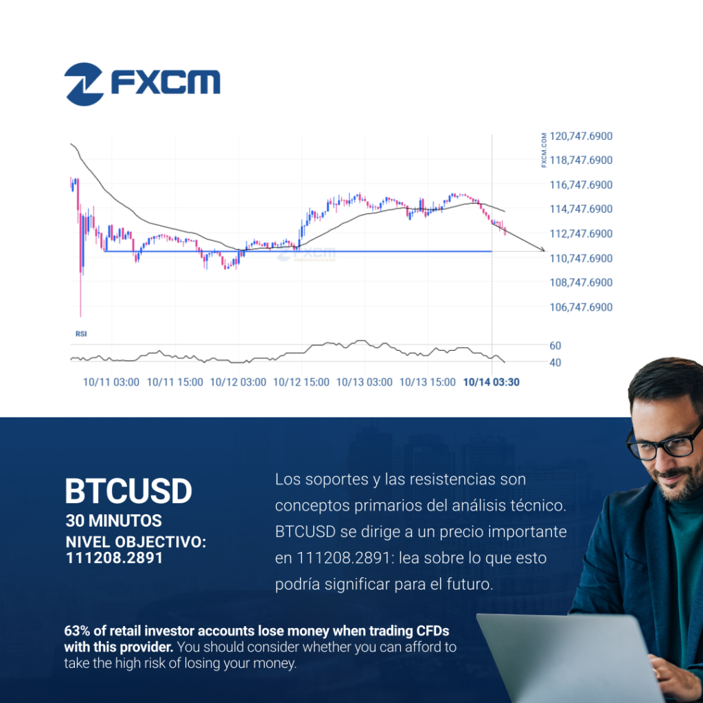 Se identificó un fuerte nivel de soporte en 111208.2891 en el gráfico de 30 Minutos de BTCUSD. Es probable que BTCUSD lo testee pronto. El rendimiento pasado no es indicativo de resultados futuros. Las pérdidas pueden exceder los fondos depositados.