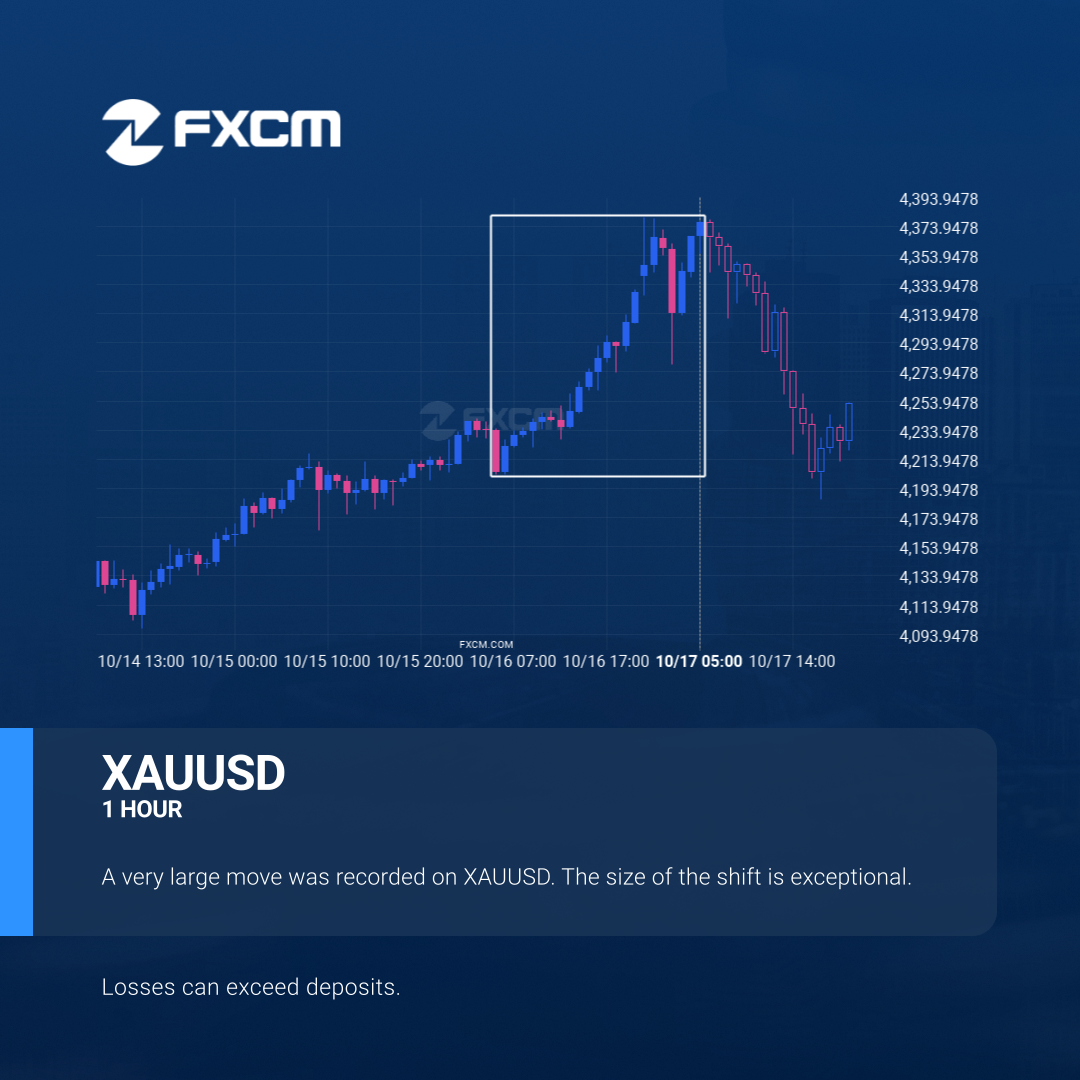 An unexpected large move occurred on XAUUSD 1 hour chart, starting at 4204.975 and reaching 4376.485. It stands out in recent trading activity.