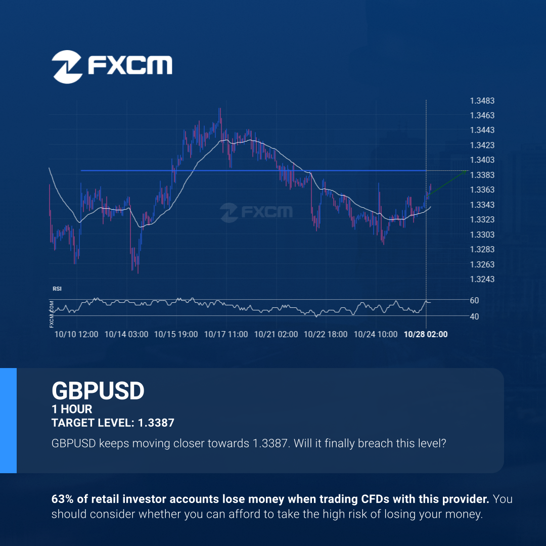 GBPUSD is approaching a resistance line at 1.3387. If it hits the resistance line, it may break through this level to continue the bullish trend, or it may turn around back to current levels.