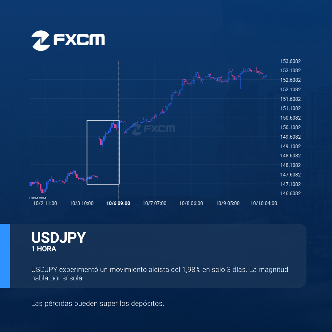 Un movimiento del 1,98% durante 3 días en USDJPY no pasa desapercibido. Podrías empezar a considerar hacia dónde se dirige ahora: si continuará la tendencia alcista o si se revertirá el movimiento previo.
