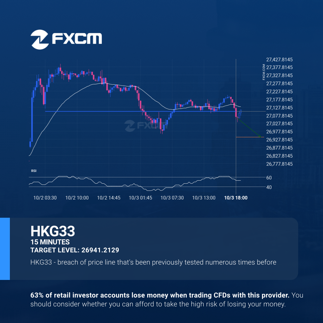 A strong support level has been breached at 27101.3691 on the 15 Minutes HKG33 chart. Technical Analysis theory forecasts a movement to 26941.2129 in the next 7 hours.