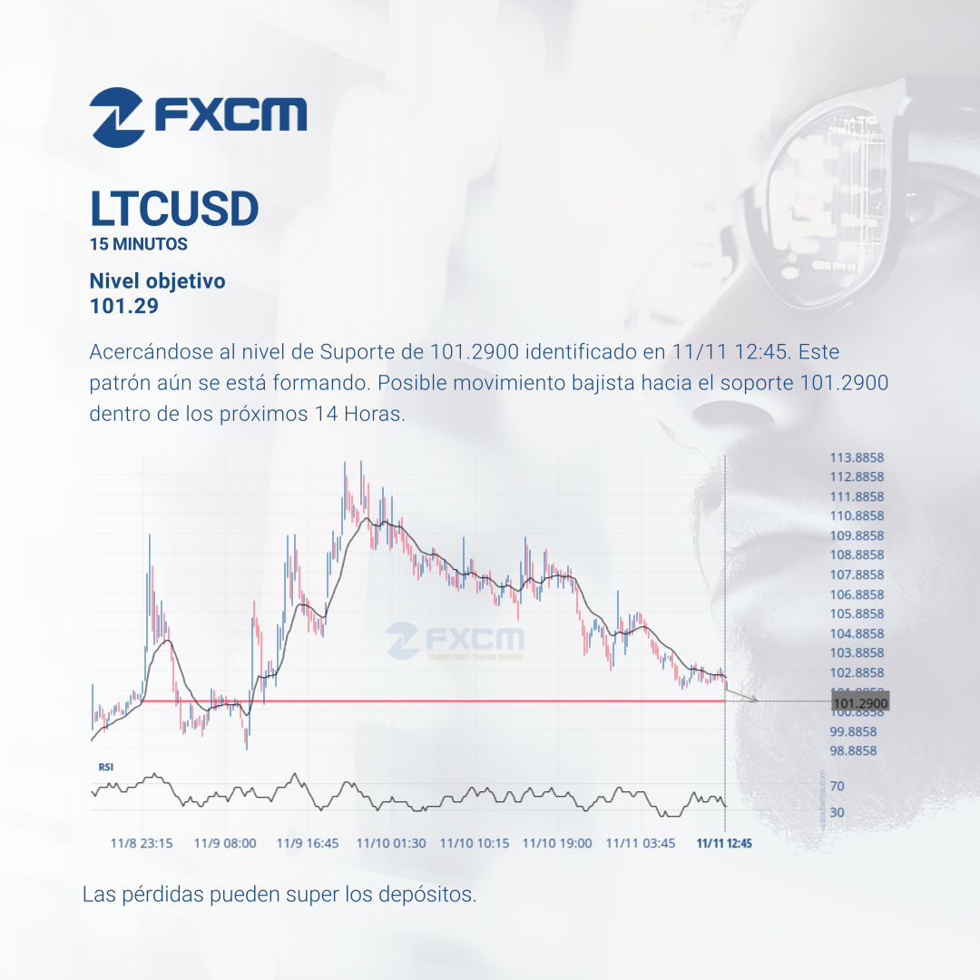 Acercándose al nivel de Suporte de 101.2900 identificado en 11/11 12:45. Este patrón aún se está formando. Posible movimiento bajista hacia el soporte 101.2900 dentro de los próximos 14 Horas.