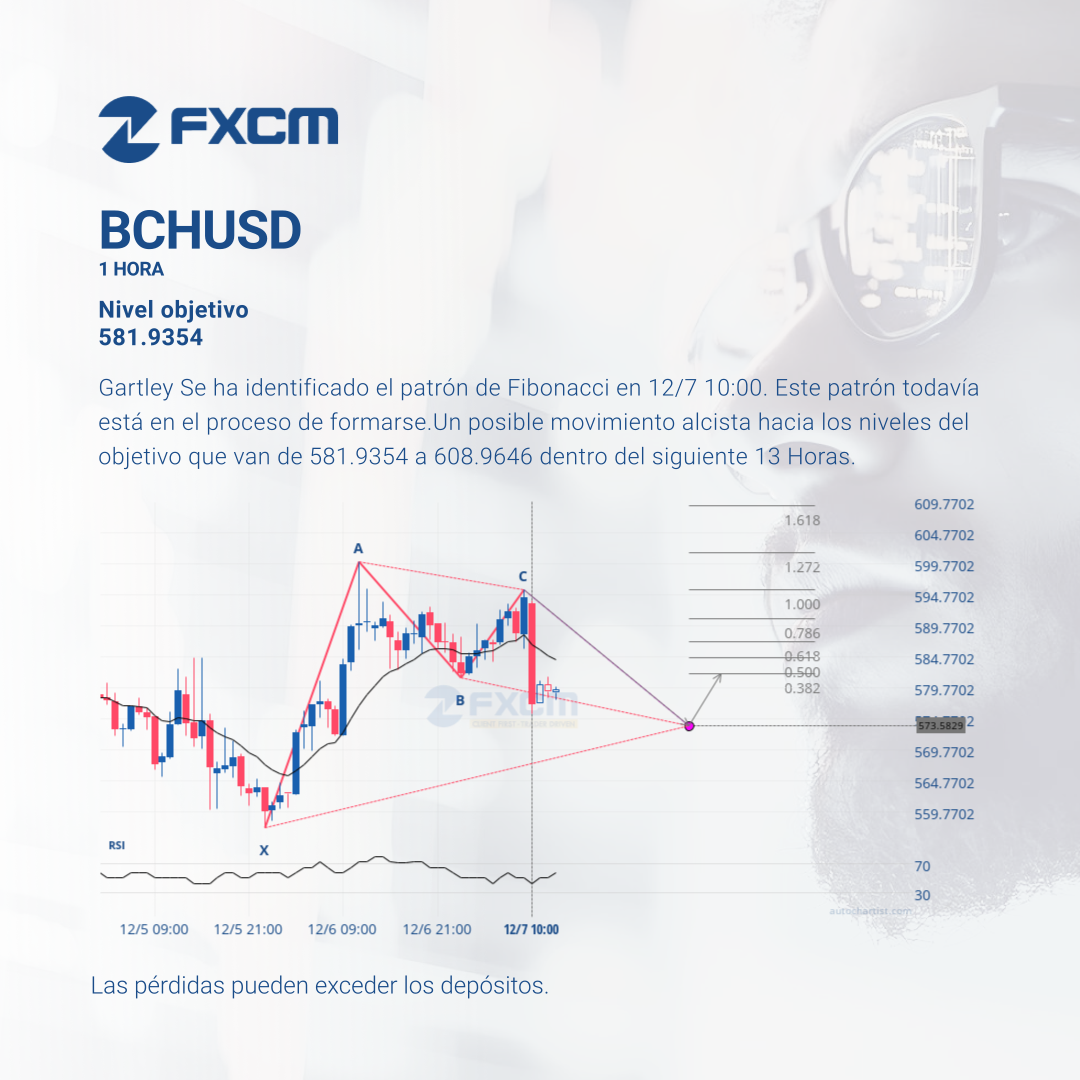 Gartley Se ha identificado el patrón de Fibonacci en 12/7 10:00. Este patrón todavía está en el proceso de formarse.Un posible movimiento alcista hacia los niveles del objetivo que van de 581.9354 a 608.9646 dentro del siguiente 13 Horas.