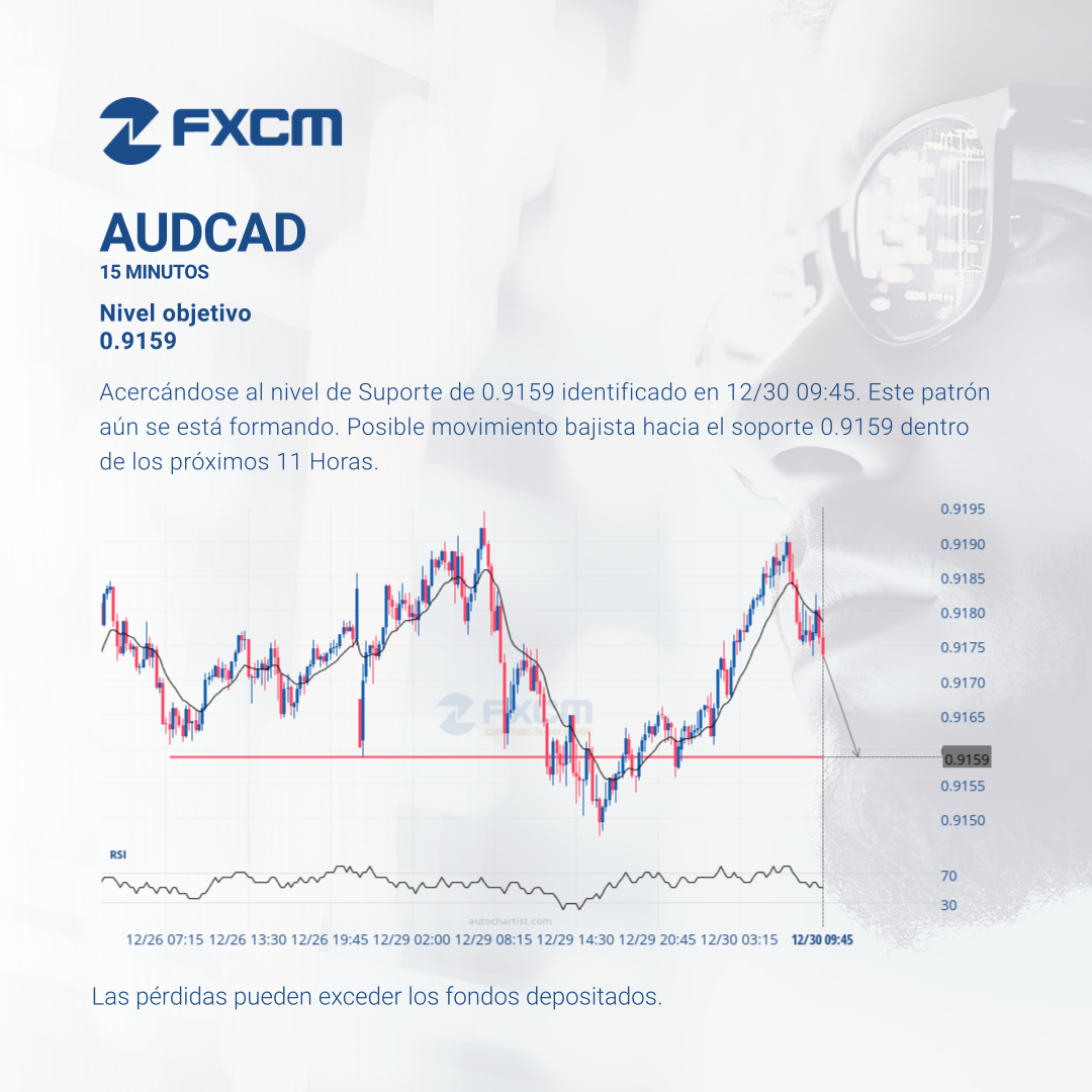 Acercándose al nivel de Suporte de 0.9159 identificado en 12/30 09:45. Este patrón aún se está formando. Posible movimiento bajista hacia el soporte 0.9159 dentro de los próximos 11 Horas.