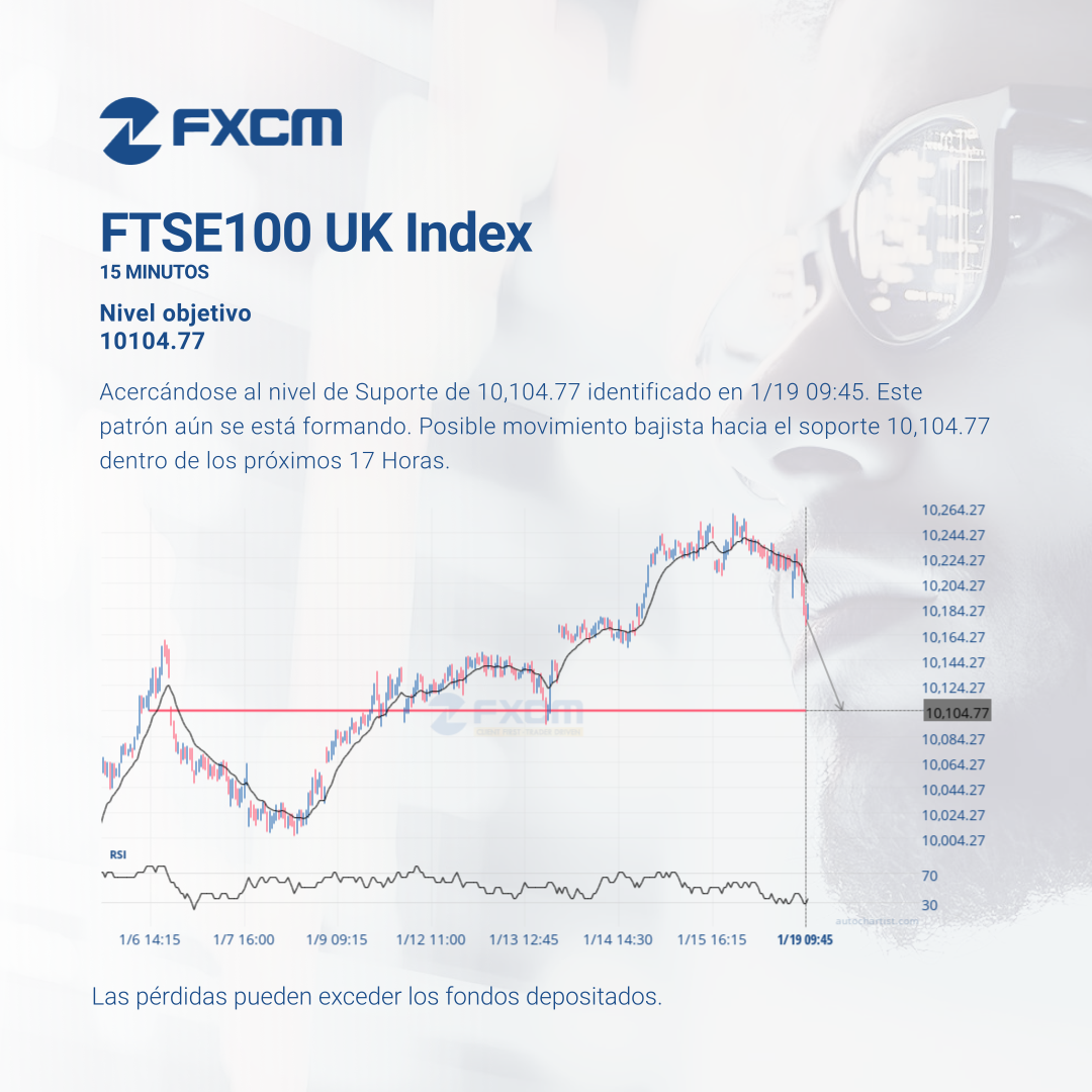 Acercándose al nivel de Suporte de 10,104.77 identificado en 1/19 09:45. Este patrón aún se está formando. Posible movimiento bajista hacia el soporte 10,104.77 dentro de los próximos 17 Horas.