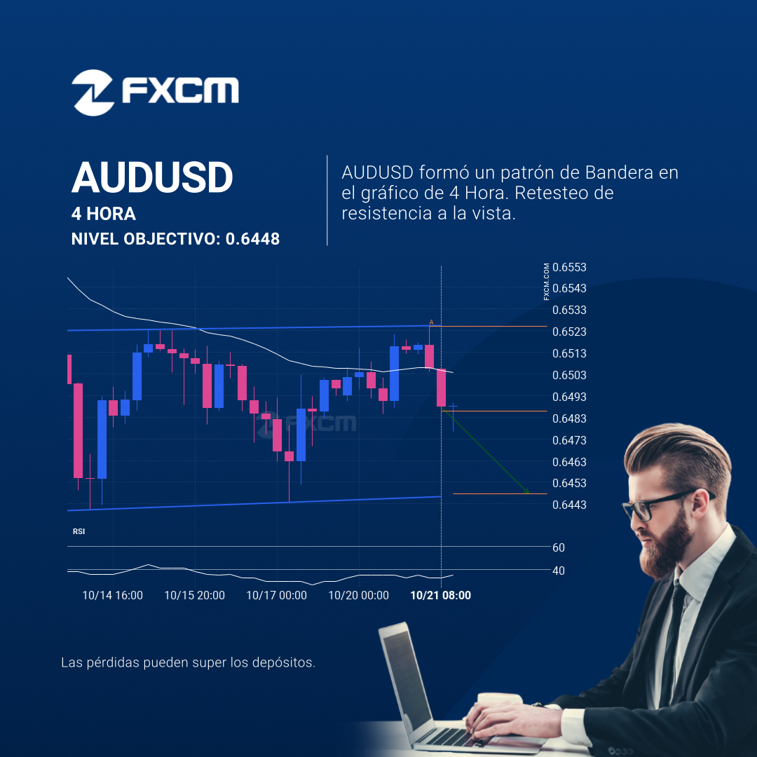 Se detectó un patrón de Bandera emergente en AUDUSD en el gráfico de 4 Hora. Hay un posible movimiento hacia 0.6448 en las próximas velas. Una vez que alcance el nivel de resistencia, puede continuar su movimiento bajista o retroceder a los niveles de precios actuales.