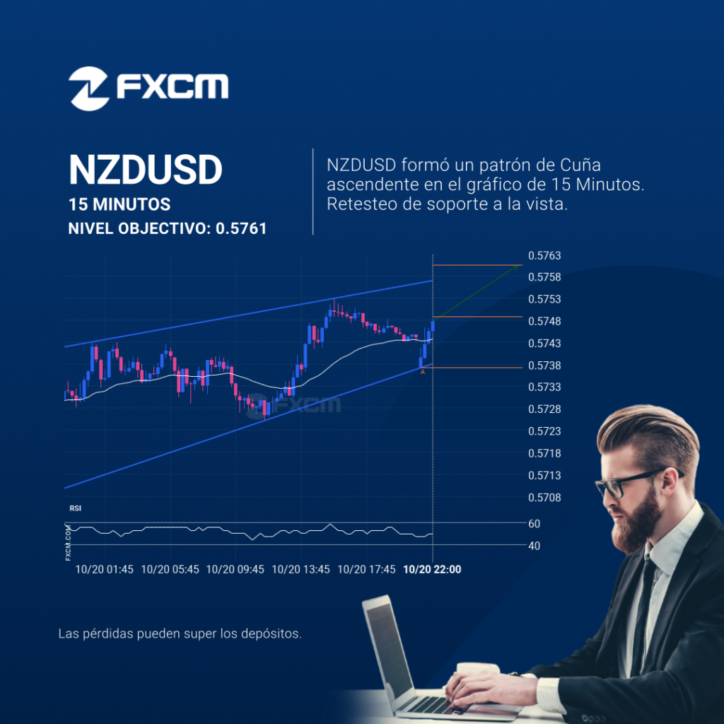 NZDUSD se identificó alrededor de 0.574885 después de haber rebotado recientemente en un nivel de soporte en el intervalo temporal de 15 Minutos. En última instancia, la acción del precio del activo ha formado un patrón de Cuña ascendente. Esta presión puede aumentar las posibilidades de una fuerte rotura. El movimiento proyectado potencialmente llevará el […]