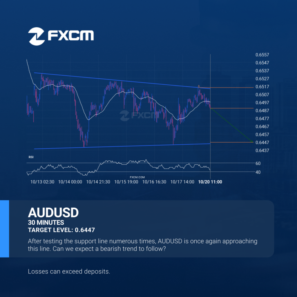 AUDUSD is approaching the support line of a Descending Triangle. It has touched this line numerous times in the last 8 days. If it tests this line again, it should do so in the next 2 days. Past performance is not an indicator of future results. Losses can exceed deposits.