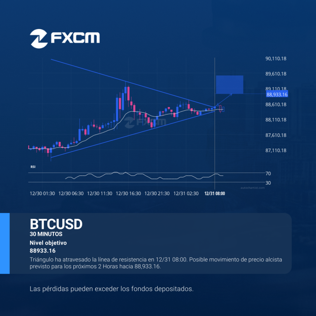 Triángulo ha atravesado la línea de resistencia en 12/31 08:00. Posible movimiento de precio alcista previsto para los próximos 2 Horas hacia 88,933.16. El rendimiento pasado no es indicativo de resultados futuros. Las pérdidas pueden exceder los depósitos.