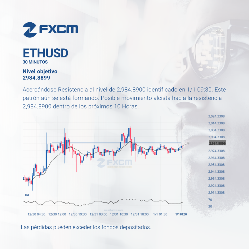 Acercándose Resistencia al nivel de 2,984.8900 identificado en 1/1 09:30. Este patrón aún se está formando. Posible movimiento alcista hacia la resistencia 2,984.8900 dentro de los próximos 10 Horas. Las pérdidas pueden exceder los depósitos.