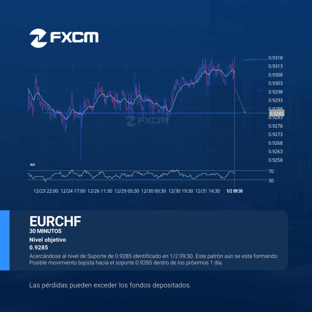 Acercándose al nivel de Suporte de 0.9285 identificado en 1/2 09:30. Este patrón aún se está formando. Posible movimiento bajista hacia el soporte 0.9285 dentro de los próximos 1 día. El rendimiento pasado no es indicativo de resultados futuros. Las pérdidas pueden exceder los depósitos.