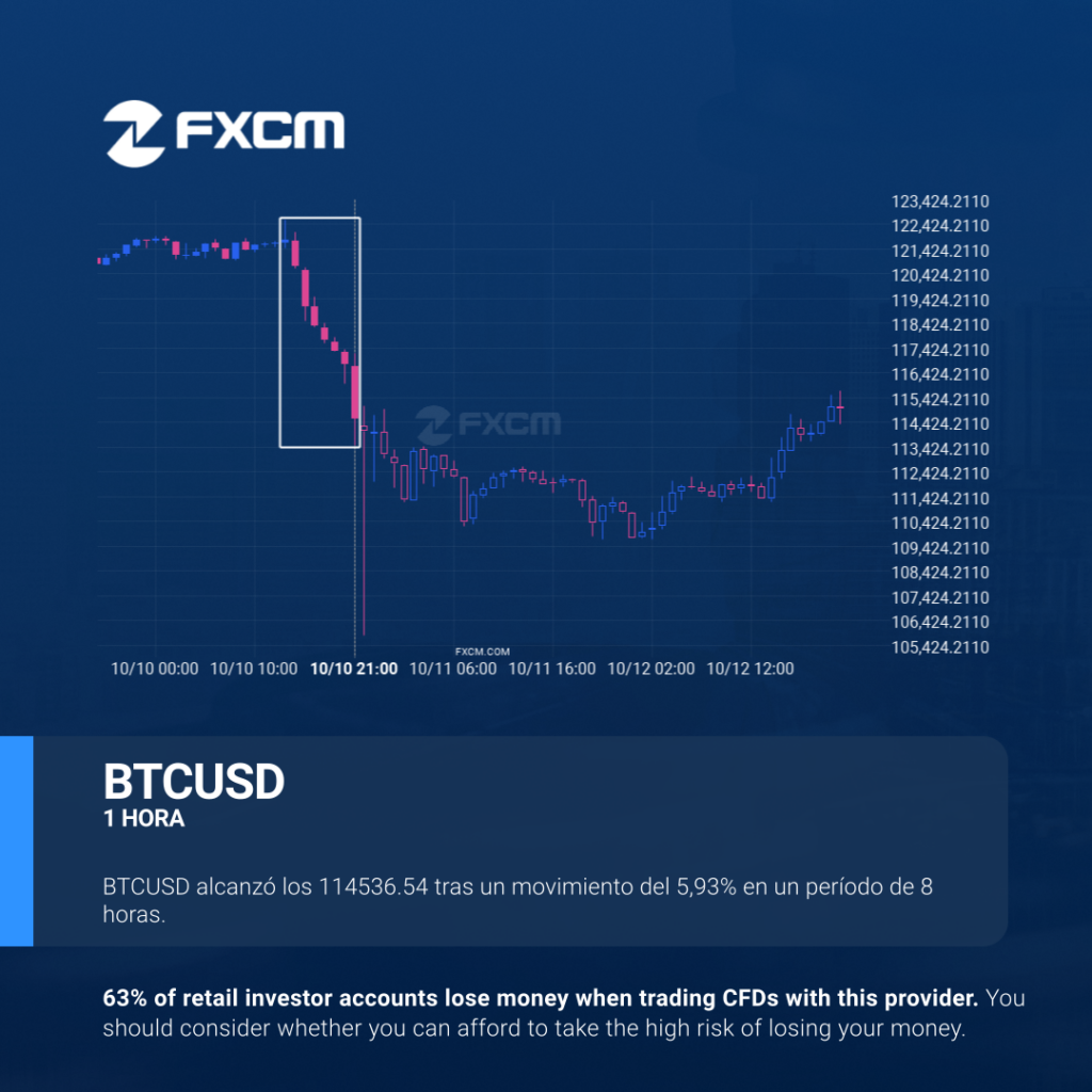 BTCUSD acaba de registrar un movimiento del 5,93% en los últimos 8 horas: un movimiento que no pasa desapercibido para ningún tipo de estrategia. El rendimiento pasado no es indicativo de resultados futuros. Las pérdidas pueden exceder los fondos depositados.