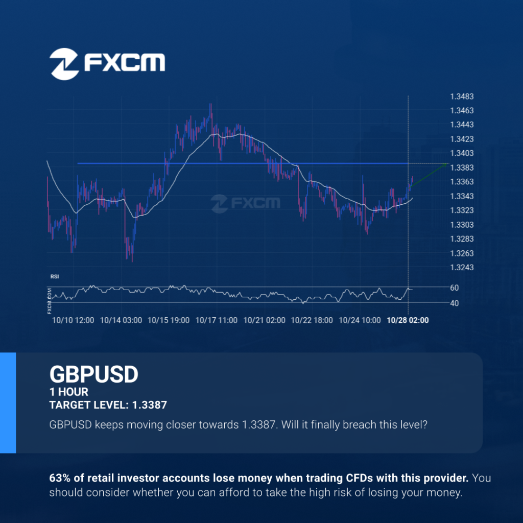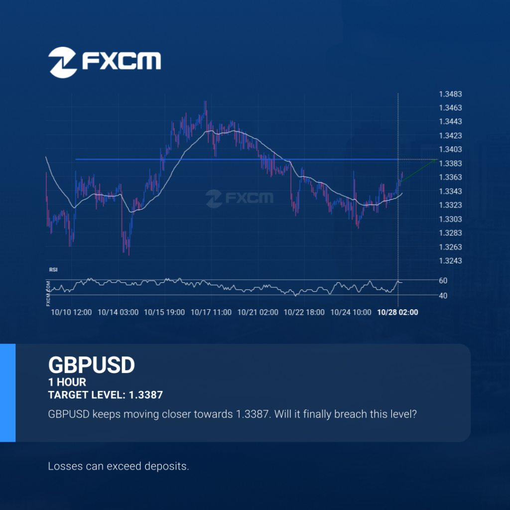 GBPUSD is approaching a resistance line at 1.3387. If it hits the resistance line, it may break through this level to continue the bullish trend, or it may turn around back to current levels. Past performance is not an indicator of future results. Losses can exceed deposits.