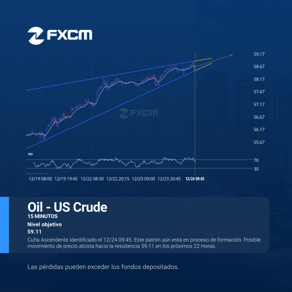 Cuña Ascendente identificado el 12/24 09:45. Este patrón aún está en proceso de formación. Posible movimiento de precio alcista hacia la resistencia 59.11 en los próximos 22 Horas. El rendimiento pasado no es indicativo de resultados futuros. Las pérdidas pueden exceder los depósitos.