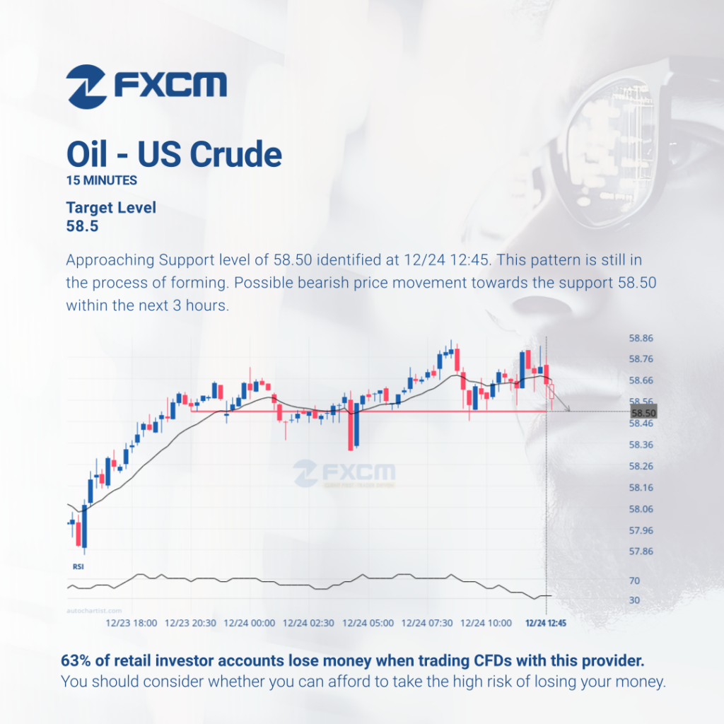 Approaching Support level of 58.50 identified at 12/24 12:45. This pattern is still in the process of forming. Possible bearish price movement towards the support 58.50 within the next 3 hours. Past performance is not an indicator of future results. Losses can exceed deposits.