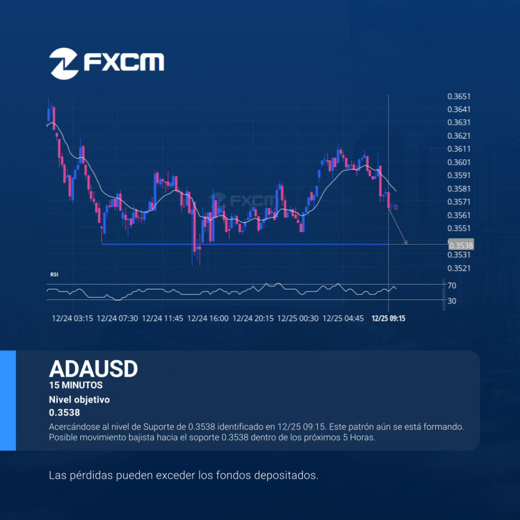 Acercándose al nivel de Suporte de 0.3538 identificado en 12/25 09:15. Este patrón aún se está formando. Posible movimiento bajista hacia el soporte 0.3538 dentro de los próximos 5 Horas. El rendimiento pasado no es indicativo de resultados futuros. Las pérdidas pueden exceder los depósitos.