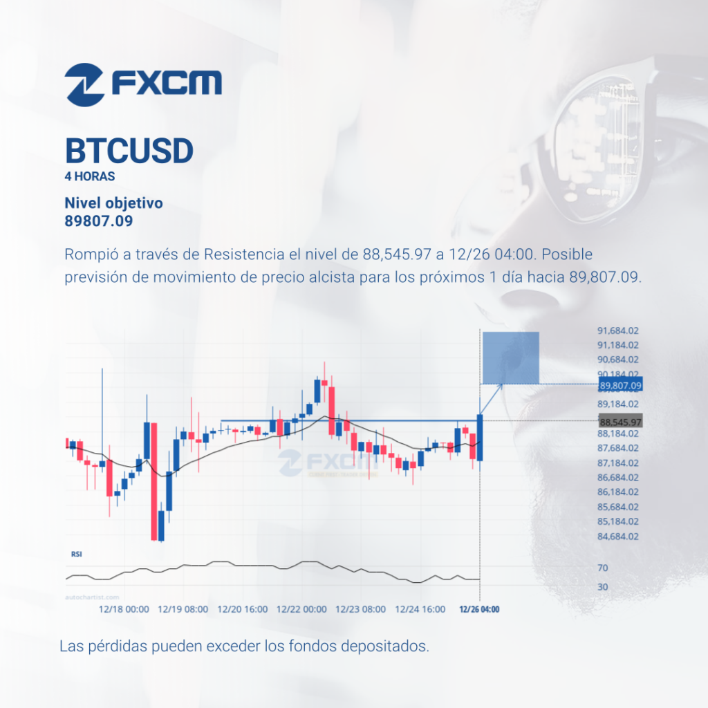 Rompió a través de Resistencia el nivel de 88,545.97 a 12/26 04:00. Posible previsión de movimiento de precio alcista para los próximos 1 día hacia 89,807.09. El rendimiento pasado no es indicativo de resultados futuros. Las pérdidas pueden exceder los depósitos.