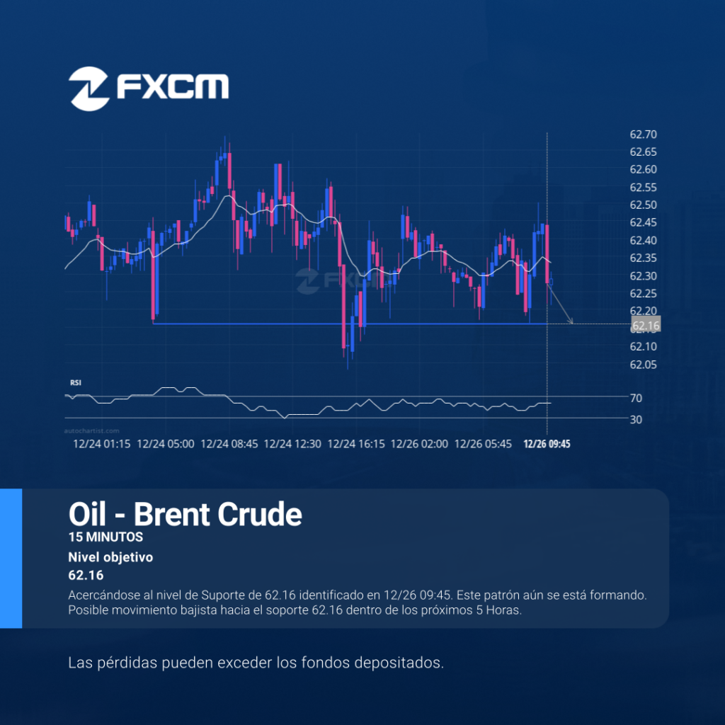 Acercándose al nivel de Suporte de 62.16 identificado en 12/26 09:45. Este patrón aún se está formando. Posible movimiento bajista hacia el soporte 62.16 dentro de los próximos 5 Horas. El rendimiento pasado no es indicativo de resultados futuros. Las pérdidas pueden exceder los depósitos.