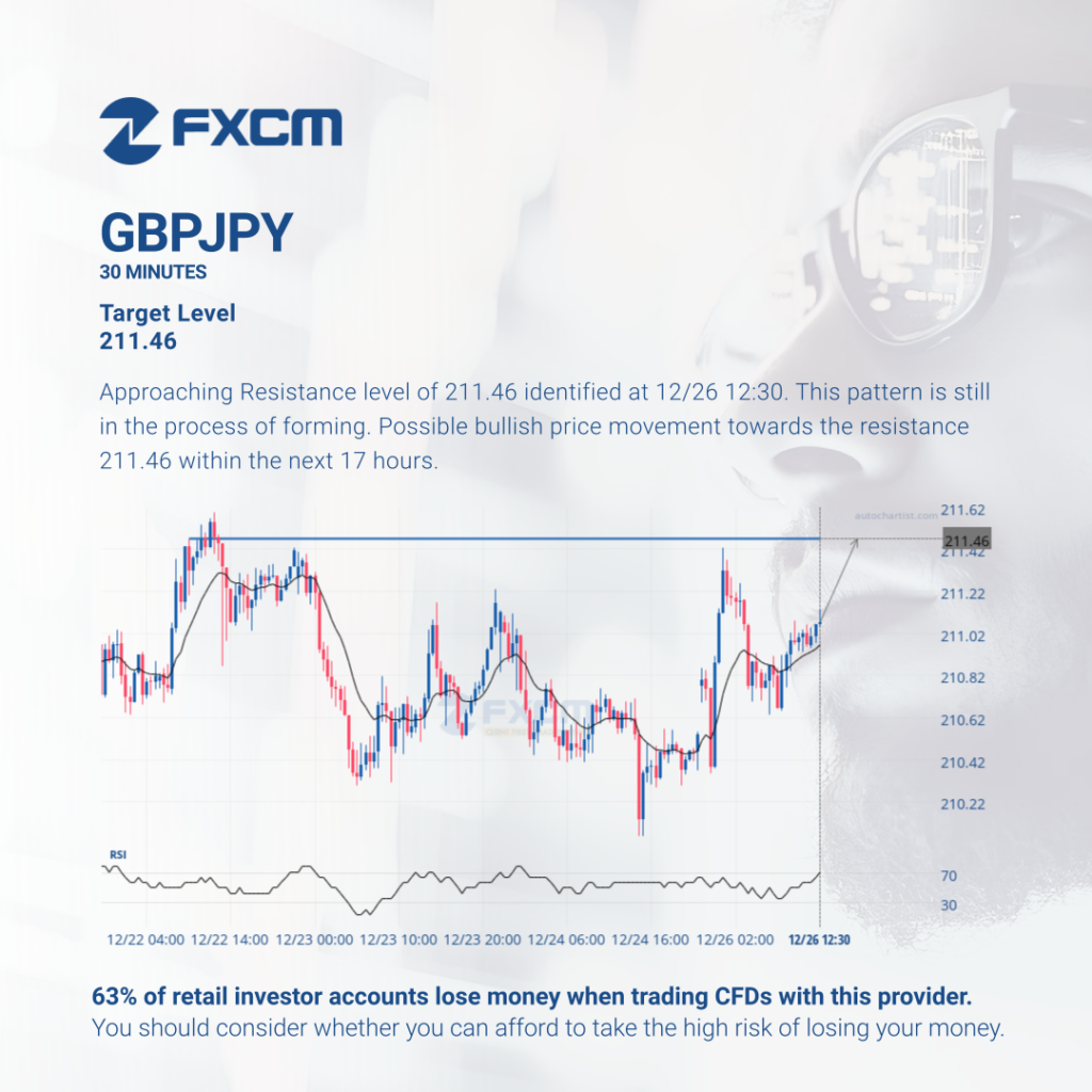 Approaching Resistance level of 211.46 identified at 12/26 12:30. This pattern is still in the process of forming. Possible bullish price movement towards the resistance 211.46 within the next 17 hours. Past performance is not an indicator of future results. Losses can exceed deposits.