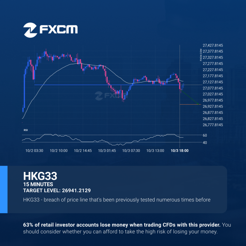 A strong support level has been breached at 27101.3691 on the 15 Minutes HKG33 chart. Technical Analysis theory forecasts a movement to 26941.2129 in the next 7 hours. Past performance is not an indicator of future results. Trading leveraged products carries significant risk. Please refer to PDS and TMD on our website. AFSL#309763
