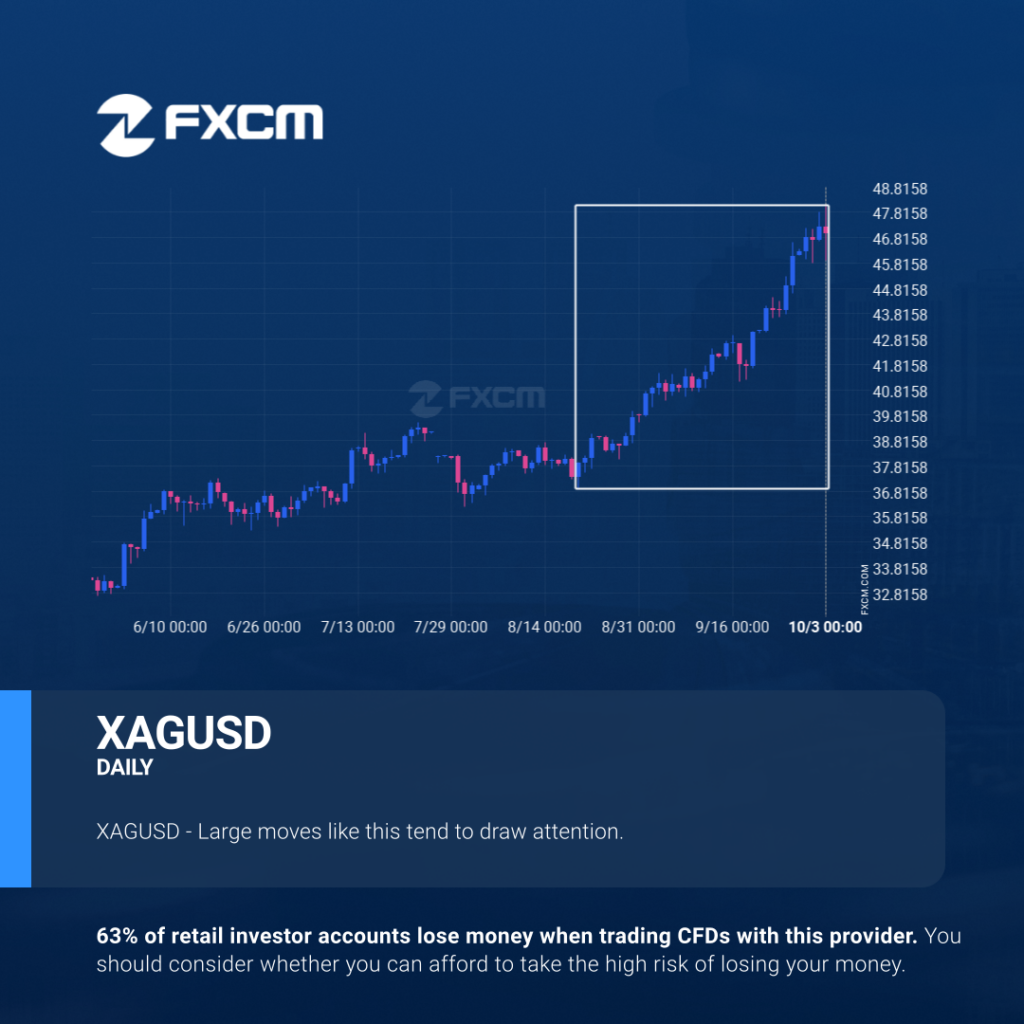 XAGUSD recorded a considerable move in the last 44 days — one of its biggest in recent sessions. Past performance is not an indicator of future results. Losses can exceed deposits.