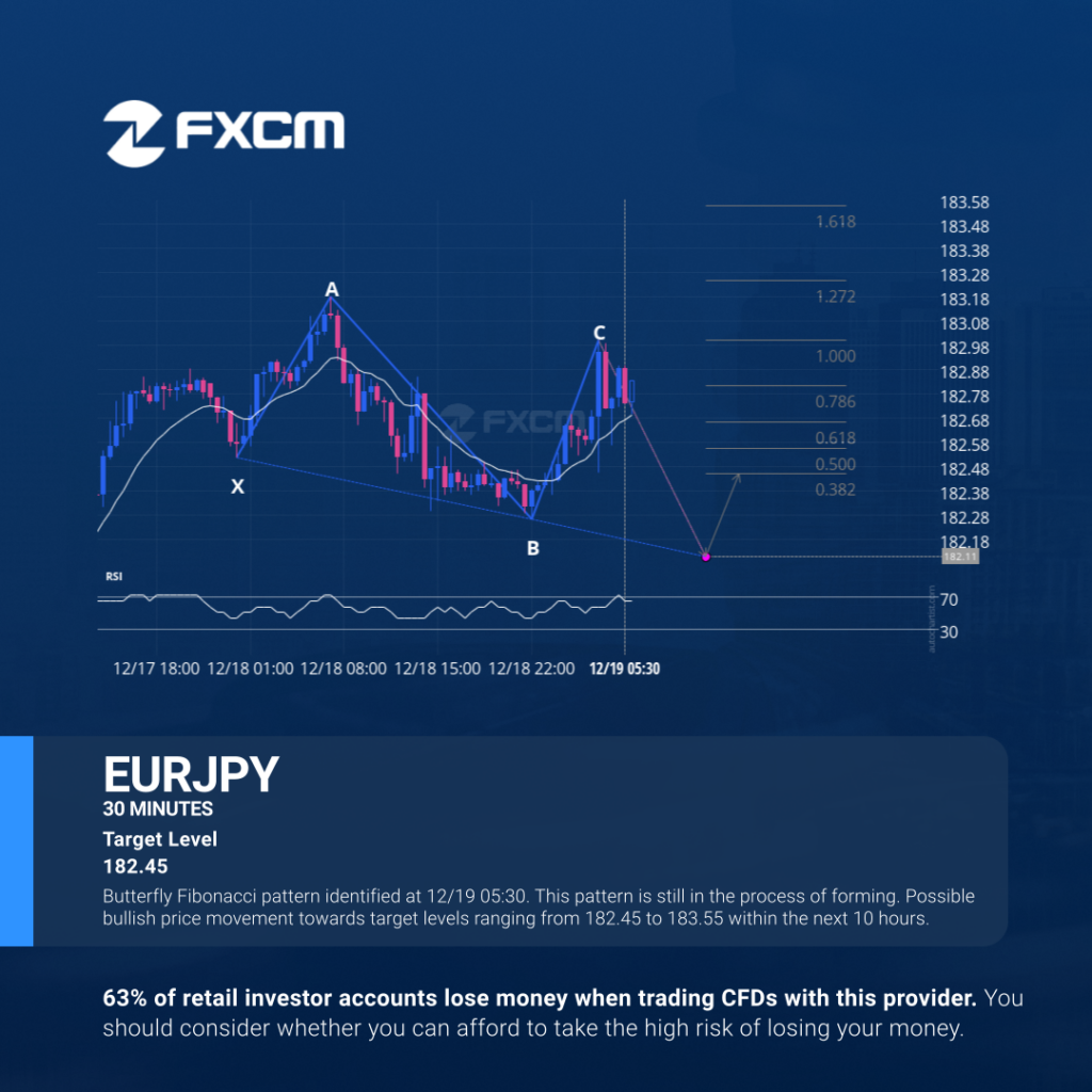 Butterfly Fibonacci pattern identified at 12/19 05:30. This pattern is still in the process of forming. Possible bullish price movement towards target levels ranging from 182.45 to 183.55 within the next 10 hours. Past performance is not an indicator of future results. Losses can exceed deposits.