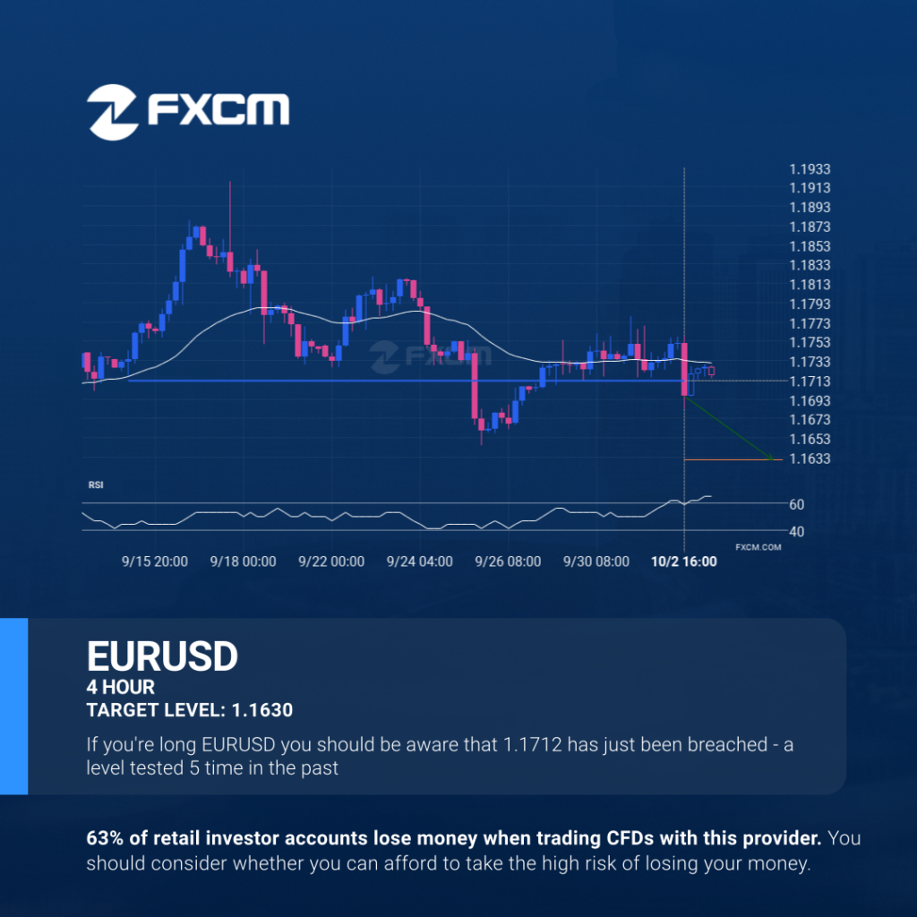 EURUSD has breached the support line at 1.1712. It may continue the bearish trend towards 1.1630, or, it may prove to be yet another test of this level. Past performance is not an indicator of future results. Losses can exceed deposits.