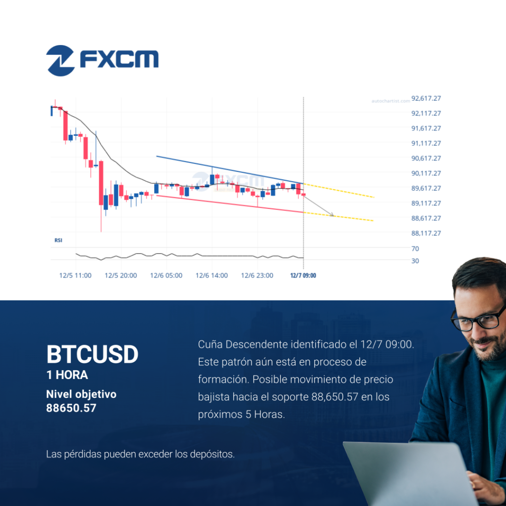 Cuña Descendente identificado el 12/7 09:00. Este patrón aún está en proceso de formación. Posible movimiento de precio bajista hacia el soporte 88,650.57 en los próximos 5 Horas. Las pérdidas pueden exceder los depósitos.