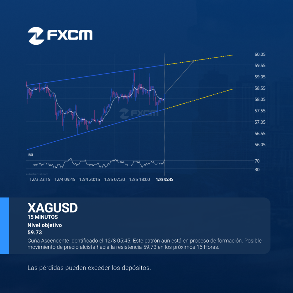 Cuña Ascendente identificado el 12/8 05:45. Este patrón aún está en proceso de formación. Posible movimiento de precio alcista hacia la resistencia 59.73 en los próximos 16 Horas. El rendimiento pasado no es indicativo de resultados futuros. Las pérdidas pueden exceder los depósitos.