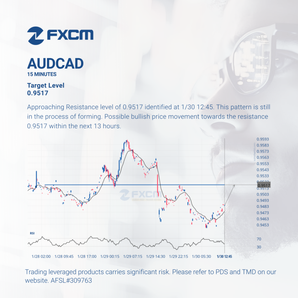 Approaching Resistance level of 0.9517 identified at 1/30 12:45. This pattern is still in the process of forming. Possible bullish price movement towards the resistance 0.9517 within the next 13 hours. Past performance is not an indicator of future results. Trading leveraged products carries significant risk. Please refer to PDS and TMD on our website. […]