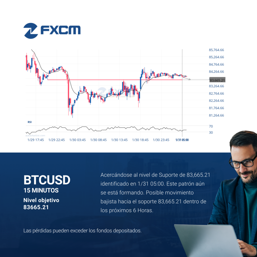 Acercándose al nivel de Suporte de 83,665.21 identificado en 1/31 05:00. Este patrón aún se está formando. Posible movimiento bajista hacia el soporte 83,665.21 dentro de los próximos 6 Horas. Las pérdidas pueden exceder los depósitos.
