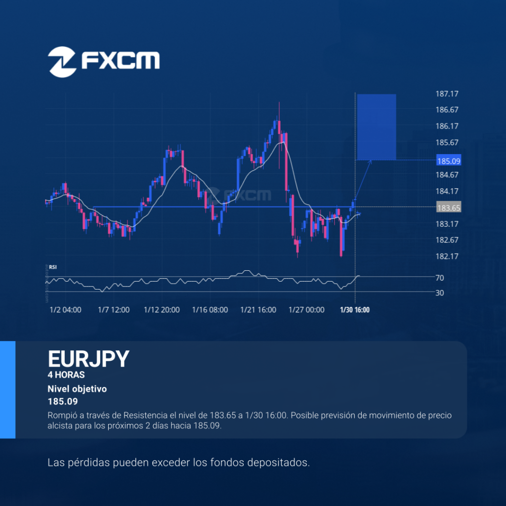 Rompió a través de Resistencia el nivel de 183.65 a 1/30 16:00. Posible previsión de movimiento de precio alcista para los próximos 2 días hacia 185.09. El rendimiento pasado no es indicativo de resultados futuros. Las pérdidas pueden exceder los depósitos.