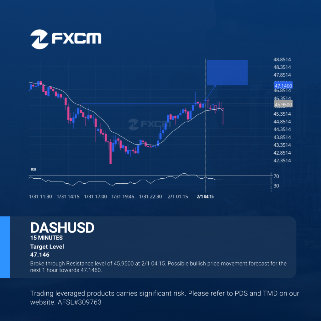 Broke through Resistance level of 45.9500 at 2/1 04:15. Possible bullish price movement forecast for the next 1 hour towards 47.1460. Past performance is not an indicator of future results. Trading leveraged products carries significant risk. Please refer to PDS and TMD on our website. AFSL#309763