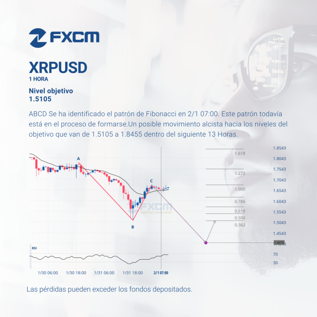 ABCD Se ha identificado el patrón de Fibonacci en 2/1 07:00. Este patrón todavía está en el proceso de formarse.Un posible movimiento alcista hacia los niveles del objetivo que van de 1.5105 a 1.8455 dentro del siguiente 13 Horas. Las pérdidas pueden exceder los depósitos.