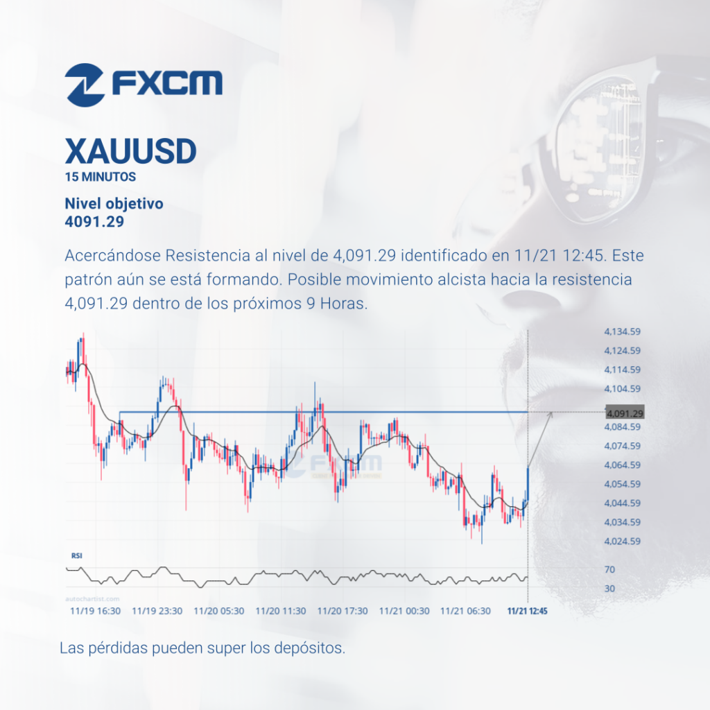 Acercándose Resistencia al nivel de 4,091.29 identificado en 11/21 12:45. Este patrón aún se está formando. Posible movimiento alcista hacia la resistencia 4,091.29 dentro de los próximos 9 Horas. El rendimiento pasado no es indicativo de resultados futuros. Las pérdidas pueden exceder los fondos depositados.